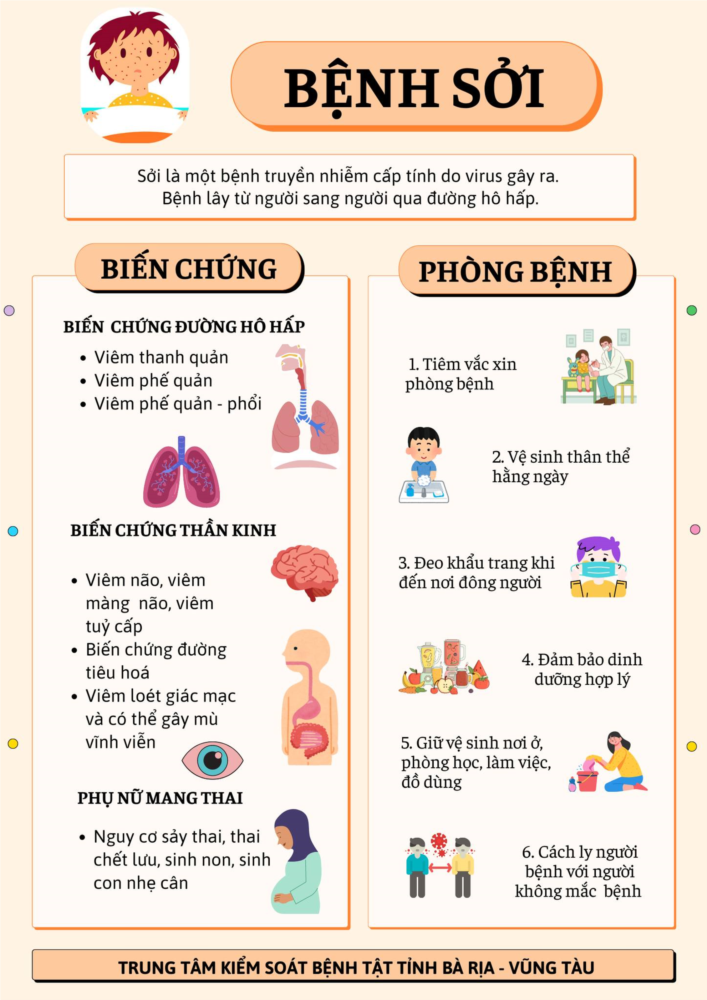 - Sởi gây nhiều biến chứng nguy hiểm cho đường hô hấp, thần kinh, tiêu hóa, tai-mũi-họng, tăng nguy cơ bội nhiễm với bệnh khác, có thể gây tử vong.